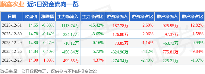 证券之星消息,截至2025年12月31日收盘,顺鑫农业(000860)报收于14.65元,下跌0.88%,换手率0.66%,成交量4.91万手,成交额7224.55万元。