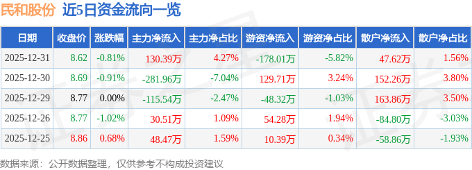 证券之星消息,截至2025年12月31日收盘,民和股份(002234)报收于8.62元,下跌0.81%,换手率1.18%,成交量3.55万手,成交额3056.75万元。