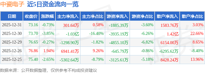 证券之星消息,截至2025年12月31日收盘,中瓷电子(003031)报收于73.16元,下跌0.73%,换手率2.09%,成交量7.1万手,成交额5.23亿元。