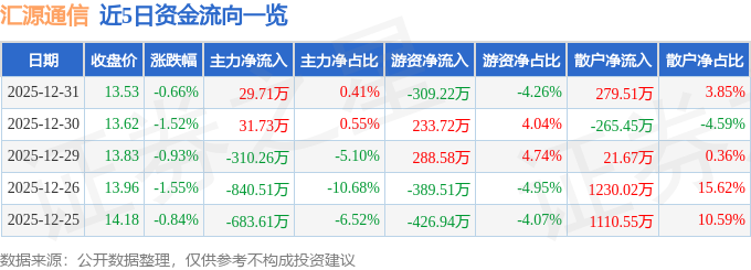 证券之星消息,截至2025年12月31日收盘,汇源通信(000586)报收于13.53元,下跌0.66%,换手率2.78%,成交量5.38万手,成交额7261.69万元。