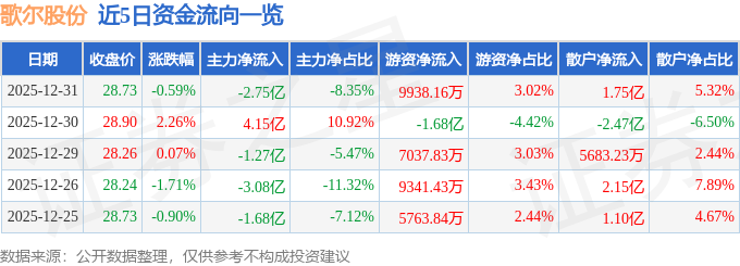 证券之星消息,截至2025年12月31日收盘,歌尔股份(002241)报收于28.73元,下跌0.59%,换手率3.63%,成交量114.06万手,成交额32.89亿元。