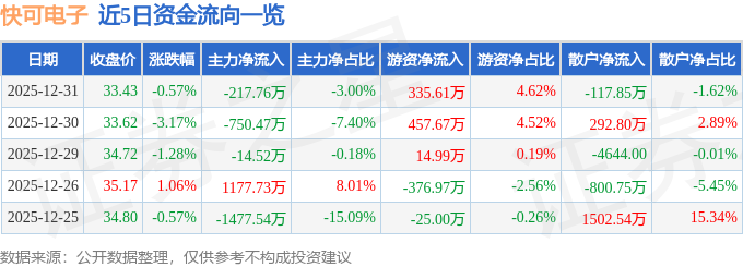证券之星消息,截至2025年12月31日收盘,快可电子(301278)报收于33.43元,下跌0.57%,换手率4.24%,成交量2.18万手,成交额7268.34万元。