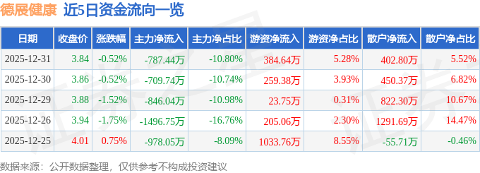 证券之星消息,截至2025年12月31日收盘,德展健康(000813)报收于3.84元,下跌0.52%,换手率0.91%,成交量19.02万手,成交额7291.17万元。