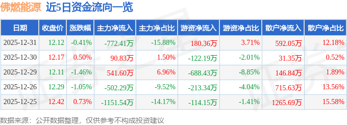 证券之星消息,截至2025年12月31日收盘,佛燃能源(002911)报收于12.12元,下跌0.41%,换手率0.32%,成交量3.99万手,成交额4862.74万元。