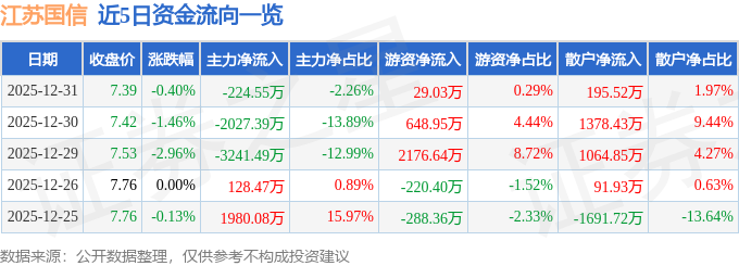 证券之星消息,截至2025年12月31日收盘,江苏国信(002608)报收于7.39元,下跌0.4%,换手率0.36%,成交量13.42万手,成交额9937.86万元。
