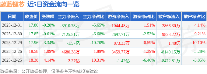 证券之星消息,截至2025年12月31日收盘,蔚蓝锂芯(002245)报收于17.8元,下跌0.28%,换手率3.57%,成交量38.79万手,成交额6.92亿元。
