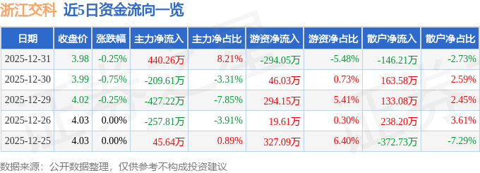 证券之星消息,截至2025年12月31日收盘,浙江交科(002061)报收于3.98元,下跌0.25%,换手率0.52%,成交量13.47万手,成交额5362.9万元。
