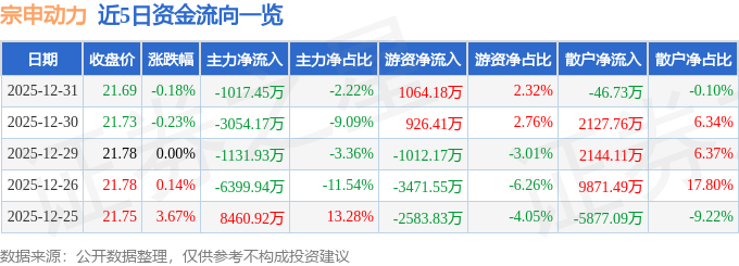 证券之星消息,截至2025年12月31日收盘,宗申动力(001696)报收于21.69元,下跌0.18%,换手率2.37%,成交量21.13万手,成交额4.59亿元。