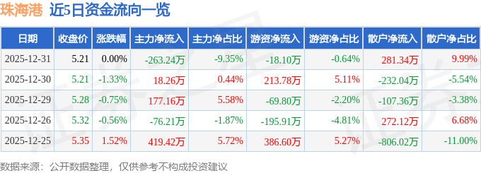 证券之星消息,截至2025年12月31日收盘,珠海港(000507)报收于5.21元,上涨0.0%,换手率0.6%,成交量5.39万手,成交额2816.42万元。