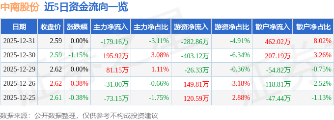 证券之星消息,截至2025年12月31日收盘,中南股份(000717)报收于2.59元,上涨0.0%,换手率0.92%,成交量22.39万手,成交额5761.38万元。