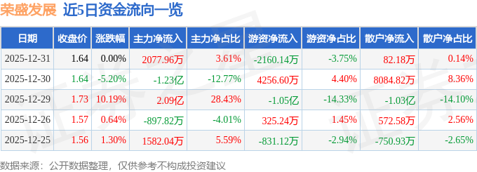 证券之星消息,截至2025年12月31日收盘,荣盛发展(002146)报收于1.64元,上涨0.0%,换手率8.93%,成交量349.3万手,成交额5.76亿元。
