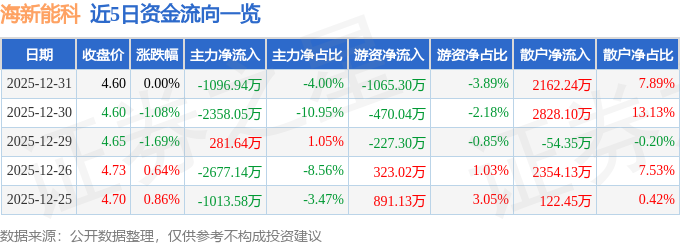 证券之星消息,截至2025年12月31日收盘,海新能科(300072)报收于4.6元,上涨0.0%,换手率2.57%,成交量59.96万手,成交额2.74亿元。