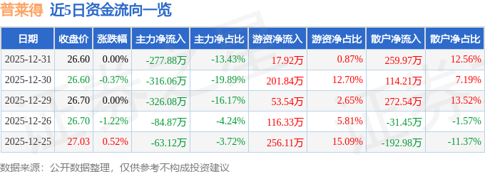 证券之星消息,截至2025年12月31日收盘,普莱得(301353)报收于26.6元,上涨0.0%,换手率2.44%,成交量7792.0手,成交额2069.71万元。
