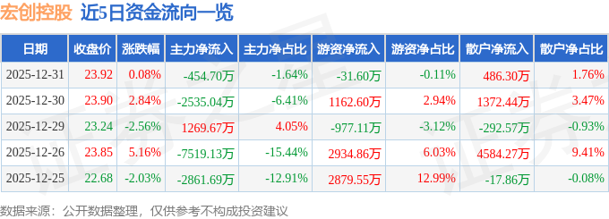 证券之星消息,截至2025年12月31日收盘,宏创控股(002379)报收于23.92元,上涨0.08%,换手率1.02%,成交量11.61万手,成交额2.77亿元。