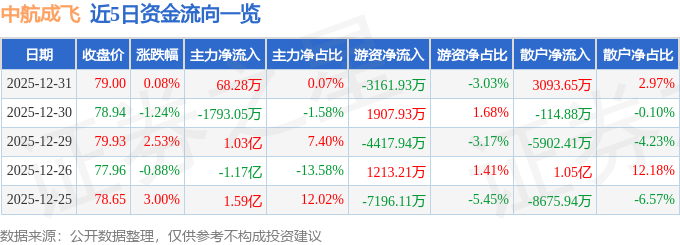 证券之星消息,截至2025年12月31日收盘,中航成飞(302132)报收于79.0元,上涨0.08%,换手率2.25%,成交量13.19万手,成交额10.43亿元。