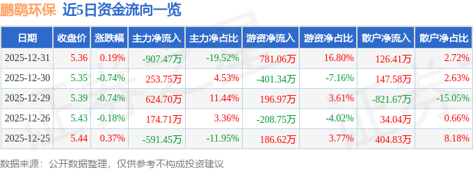 证券之星消息,截至2025年12月31日收盘,鹏鹞环保(300664)报收于5.36元,上涨0.19%,换手率1.15%,成交量8.67万手,成交额4650.08万元。