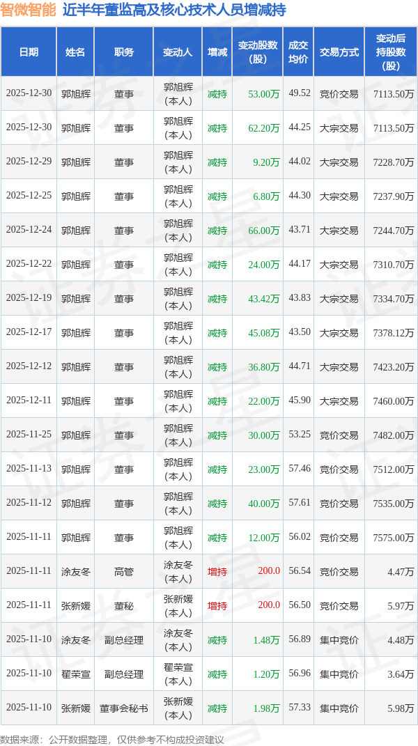 智微智能近半年内的董监高及核心技术人员增减持详情如下: