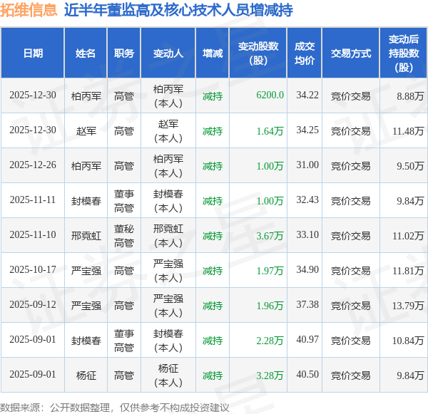 拓维信息近半年内的董监高及核心技术人员增减持详情如下: