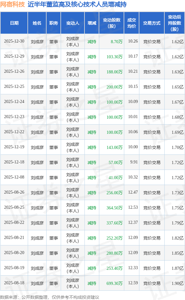 证券之星消息,根据12月31日市场公开信息、上市公司公告及交易所披露数据整理,网宿科技(300017)最新董监高及相关人员股份变动情况:2025年12月30日公司董事刘成彦共减持公司股份8.7万股,占公司总股本为0.0035%。变动期间公司股价上涨1.28%,12月30日当日收盘报10.26元。
