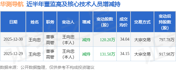 证券之星消息,根据12月31日市场公开信息、上市公司公告及交易所披露数据整理,华测导航(300627)最新董监高及相关人员股份变动情况:2025年12月30日公司董事,高管王向忠共减持公司股份120.2万股,占公司总股本为0.1528%。变动期间公司股价上涨1.61%,12月30日当日收盘报34.04元。