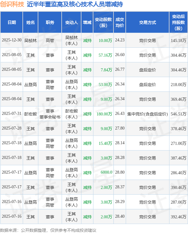创识科技近半年内的董监高及核心技术人员增减持详情如下: