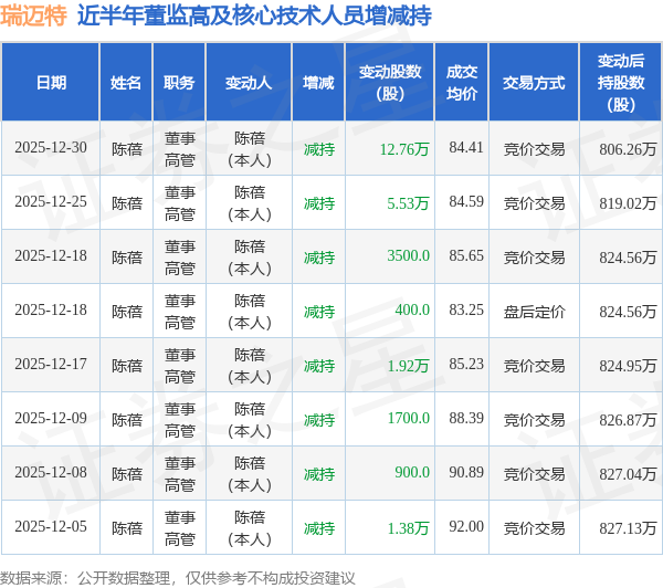 瑞迈特近半年内的董监高及核心技术人员增减持详情如下: