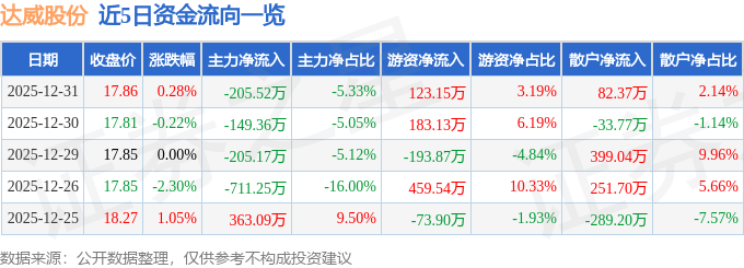 证券之星消息,截至2025年12月31日收盘,达威股份(300535)报收于17.86元,上涨0.28%,换手率2.87%,成交量2.17万手,成交额3855.79万元。