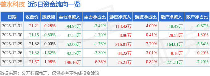 证券之星消息,截至2025年12月31日收盘,善水科技(301190)报收于21.21元,上涨0.28%,换手率0.82%,成交量1.31万手,成交额2773.16万元。