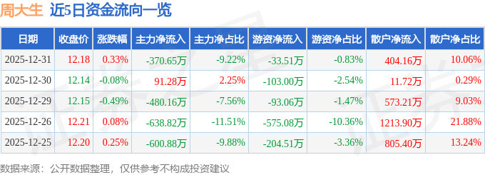 证券之星消息,截至2025年12月31日收盘,周大生(002867)报收于12.18元,上涨0.33%,换手率0.31%,成交量3.3万手,成交额4018.46万元。