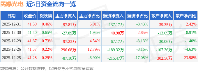 证券之星消息,截至2025年12月31日收盘,民爆光电(301362)报收于41.59元,上涨0.46%,换手率1.32%,成交量3928.0手,成交额1626.74万元。