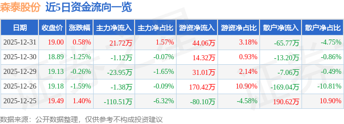 证券之星消息,截至2025年12月31日收盘,森泰股份(301429)报收于19.0元,上涨0.58%,换手率1.67%,成交量7350.0手,成交额1383.74万元。