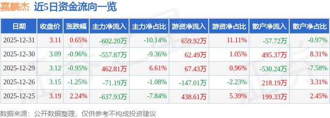 证券之星消息,截至2025年12月31日收盘,嘉麟杰(002486)报收于3.11元,上涨0.65%,换手率2.34%,成交量19.18万手,成交额5938.66万元。