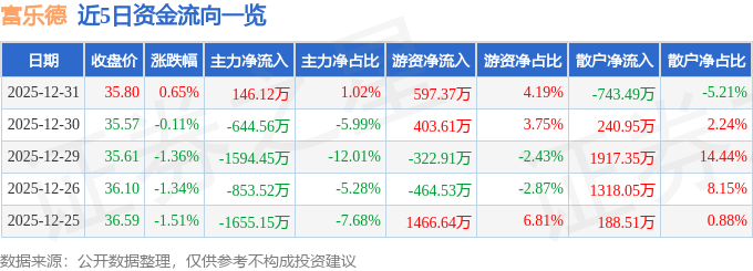 证券之星消息,截至2025年12月31日收盘,富乐德(301297)报收于35.8元,上涨0.65%,换手率1.16%,成交量3.96万手,成交额1.43亿元。