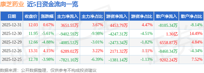 证券之星消息,截至2025年12月31日收盘,康芝药业(300086)报收于12.03元,上涨0.67%,换手率18.71%,成交量82.46万手,成交额9.96亿元。