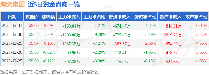 证券之星消息,截至2025年12月31日收盘,海安集团(001233)报收于59.66元,上涨0.69%,换手率6.69%,成交量2.37万手,成交额1.4亿元。
