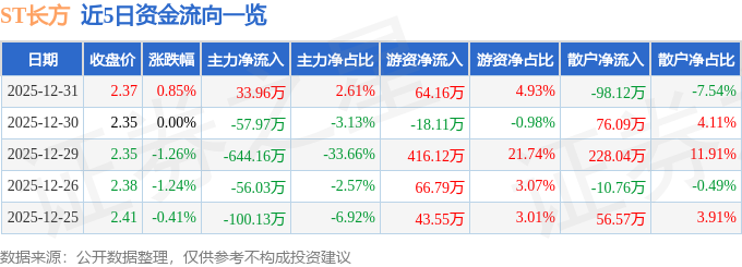 证券之星消息,截至2025年12月31日收盘,ST长方(300301)报收于2.37元,上涨0.85%,换手率0.7%,成交量5.55万手,成交额1301.77万元。