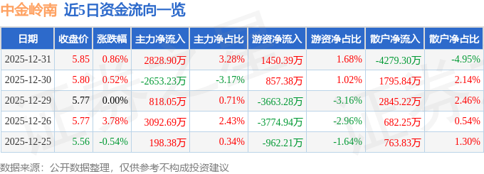 证券之星消息,截至2025年12月31日收盘,中金岭南(000060)报收于5.85元,上涨0.86%,换手率3.31%,成交量146.97万手,成交额8.64亿元。