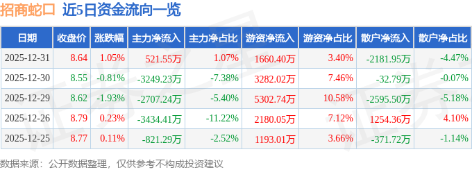 证券之星消息,截至2025年12月31日收盘,招商蛇口(001979)报收于8.64元,上涨1.05%,换手率0.67%,成交量56.67万手,成交额4.88亿元。