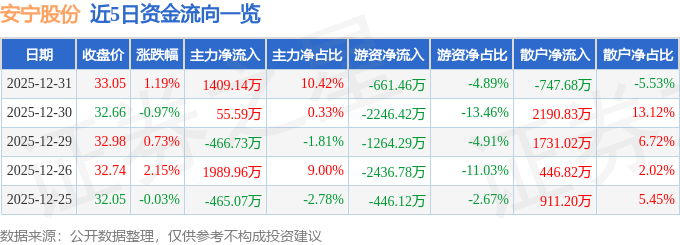 证券之星消息,截至2025年12月31日收盘,安宁股份(002978)报收于33.05元,上涨1.19%,换手率1.11%,成交量4.11万手,成交额1.35亿元。
