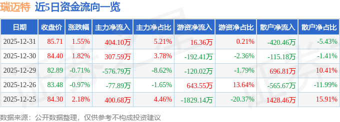 证券之星消息,截至2025年12月31日收盘,瑞迈特(301367)报收于85.71元,上涨1.55%,换手率1.29%,成交量9053.0手,成交额7749.67万元。