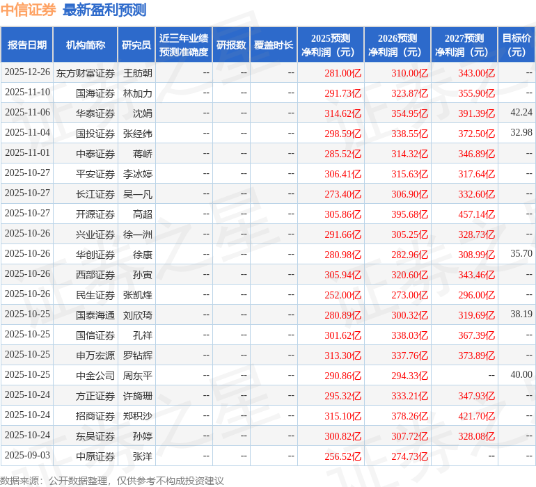 投资建议:在国内资本市场改革深化、监管趋严背景下,证券行业“马太效应”愈发显著,资本实力、风控能力、综合服务能力更强的头部券商有望持续沧占市场份额。公司作为行业龙头,不仅在规模和业绩上遥遥领先,更在财富管理、跨境投行、主动资管等高质量发展领域持续突破,形成了可持续的增长动力,有望在市场周期波动中保持优于行业的业绩表现。我们预计公司25/26/27年归母净利润分别为264.5/306.85/339.42亿元,同比+21.87%/+16.01%/+10.61%,对应PE16.09x/13.87x/12.54x。按照可比公司估值法,预测公司25/26/27年BVPS、EPS分别为21.96/24.07/26.41元和1.78/2.07/2.29元;给予公司一定估值溢价,26年调整后PB、PE估值为1.39x、15.69x,对应股价分别为33.48元和32.48元,首次覆盖给予买入评级