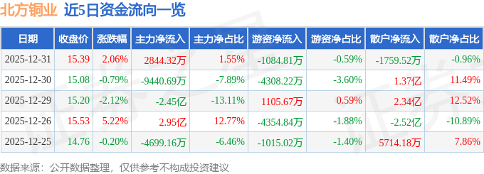 证券之星消息,截至2025年12月31日收盘,北方铜业(000737)报收于15.39元,上涨2.06%,换手率6.17%,成交量117.57万手,成交额18.29亿元。