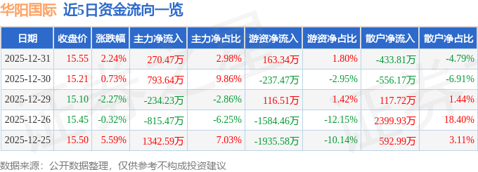 证券之星消息,截至2025年12月31日收盘,华阳国际(002949)报收于15.55元,上涨2.24%,换手率3.85%,成交量5.85万手,成交额9062.74万元。