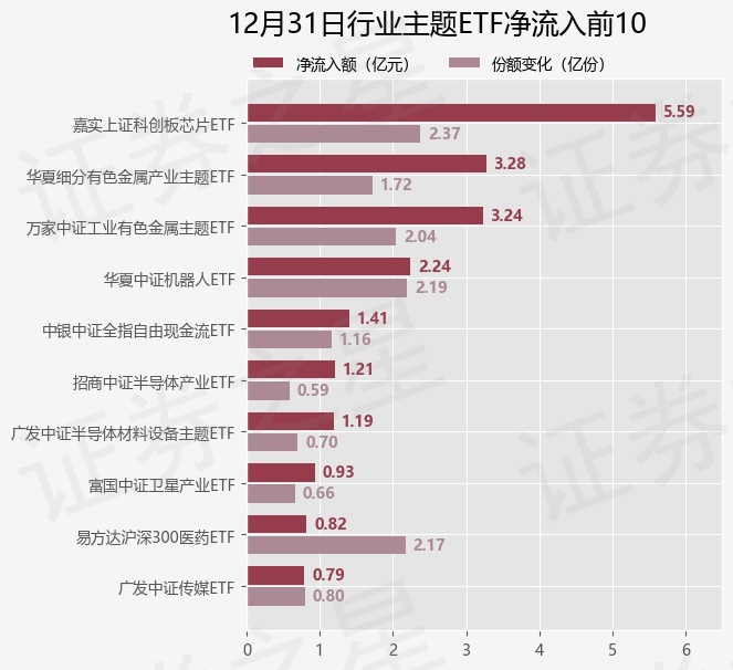 证券之星消息,12月31日行业主题ETF基金合计资金净流入2.62亿元,近5个交易日累计净流出37.65亿元,5个交易日中出现日合计资金净流出的有3天(ETF资金流向计算公式:(当日ETF场内流通份额-前一交易日ETF场内流通份额)*当日ETF均价,计算结果仅供参考)。