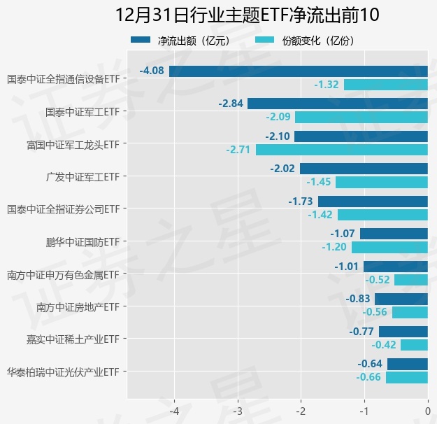 当日有112只行业主题ETF基金出现资金净流出,其中净流出排首位的是国泰中证全指通信设备ETF(515880),份额减少了1.32亿份,净流出额为4.08亿元。