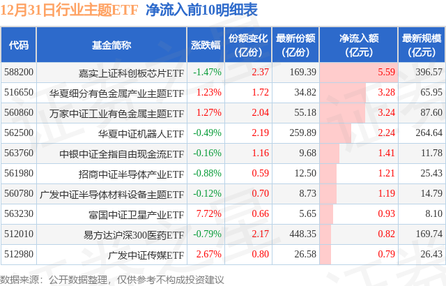 当日有80只行业主题ETF基金出现资金净流入,其中净流入排首位的是嘉实上证科创板芯片ETF(588200),份额增加了2.37亿份,净流入额为5.59亿元。