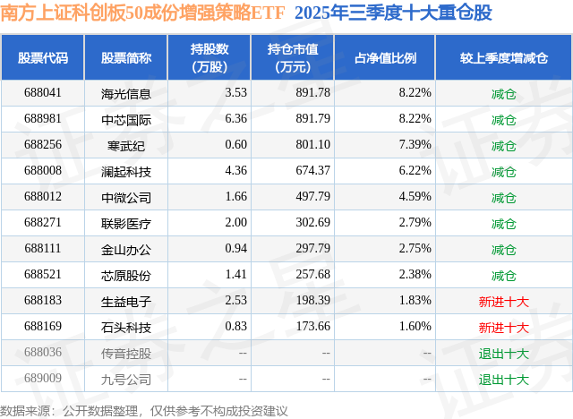南方上证科创板50成份增强策略ETF基金成立于2022年12月1日,基金经理为朱恒红,基金跟踪标的为上证科创板50成份指数,成立以来超额回报为8.24%,近一个月超额回报为1.58%。最新披露的基金持仓数据显示,截止2025年9月30日,该基金第一大重仓股为海光信息(688041),持股占比为8.22%。