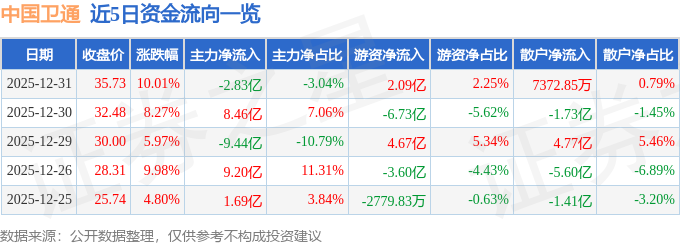 证券之星消息,截至2025年12月31日收盘,中国卫通(601698)报收于35.73元,上涨10.01%,涨停,换手率6.47%,成交量273.18万手,成交额93.09亿元。