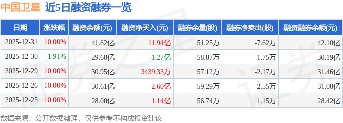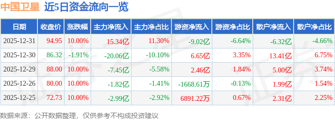证券之星消息,截至2025年12月31日收盘,中国卫星(600118)报收于94.95元,上涨10.0%,涨停,换手率12.46%,成交量147.36万手,成交额135.79亿元。