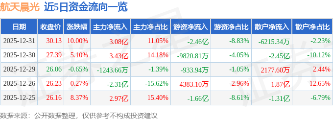 证券之星消息,截至2025年12月31日收盘,航天晨光(600501)报收于30.13元,上涨10.0%,涨停,换手率22.43%,成交量95.95万手,成交额27.91亿元。